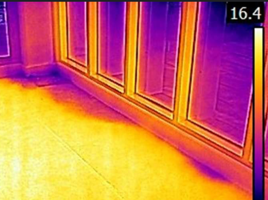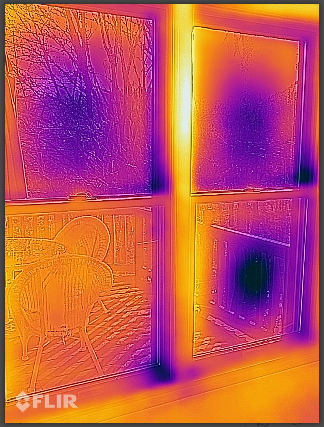 Areas where cold or warm air enters or escapes through window frames, doors, or walls will appear cooler or warmer than their surroundings.